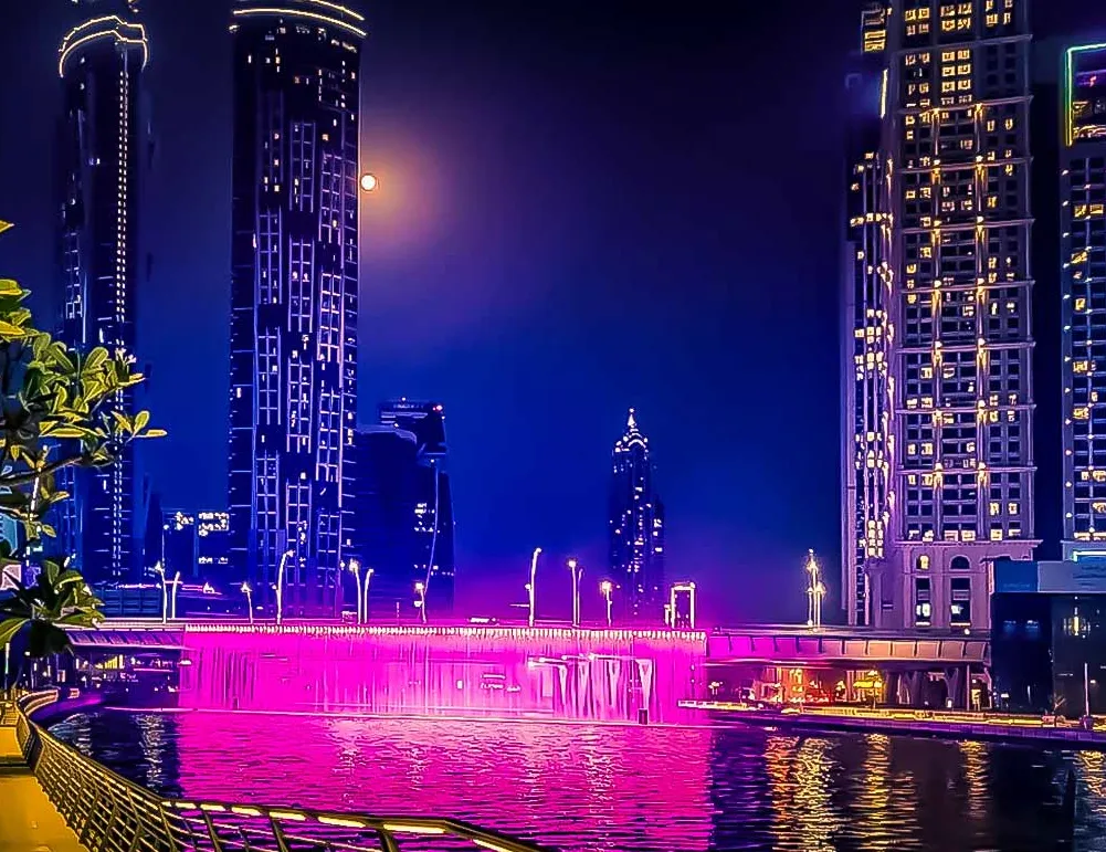 Dubaiβs newest waterfront attraction, the Dubai Water Canal, stretches from Business Bay to Jumeirah, offering spectacular views of illuminated landmarks such as the JW Marriott Marquis, Sheikh Zayed Road Waterfall Bridge, and the glowing skyline of Downtown Dubai.