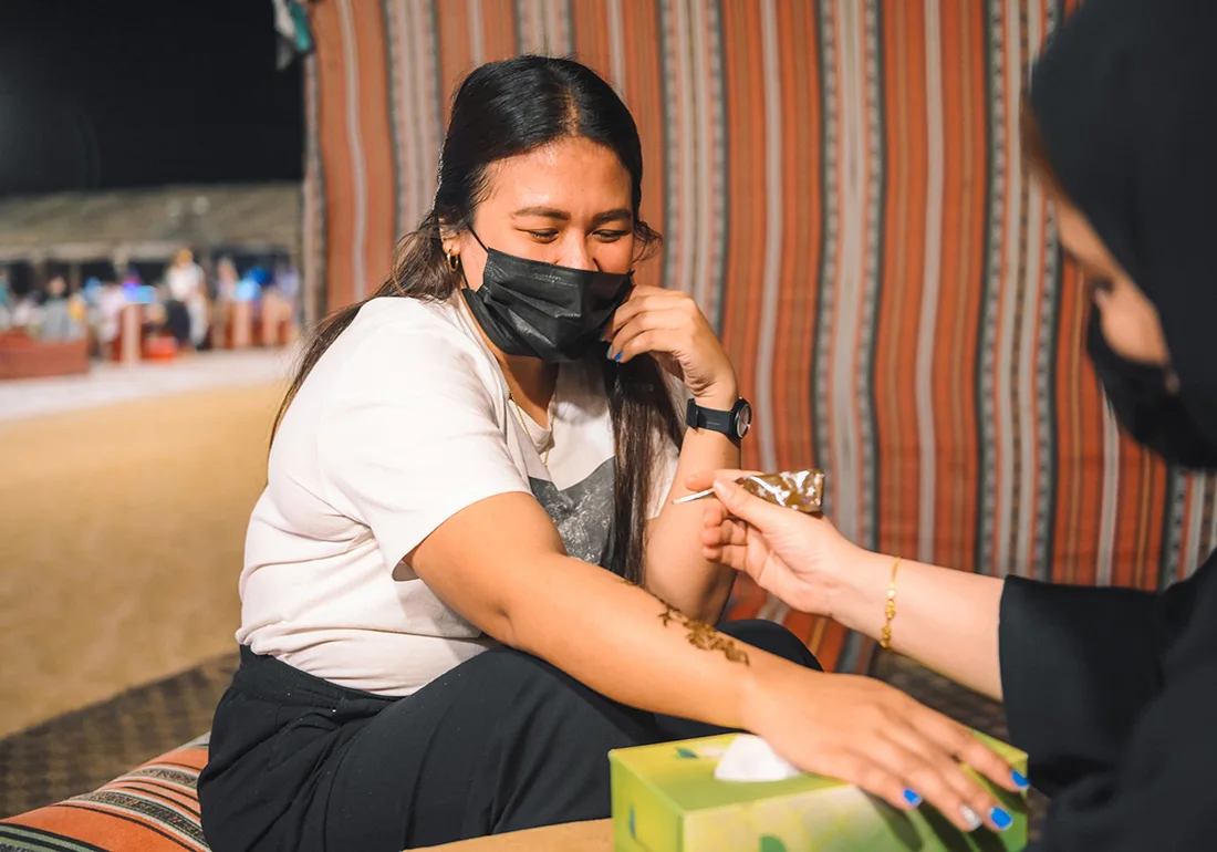 Enjoy a warm Arabic welcome with tea, dates, and sweets. Relax in Bedouin-style seating while exploring cultural activities like Henna painting and Arabic dress photography.